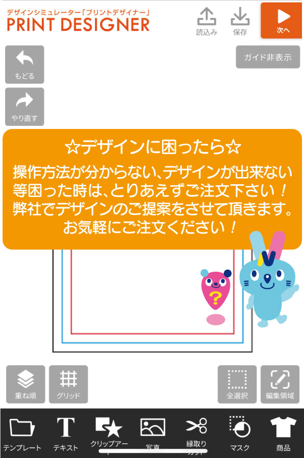 デザイン作成途中でも弊社デザイナーがデータ作成のお手伝いをいたします。お気軽にご注文下さい。