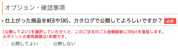 本日より、ご注文時に「○公開してよい」を選択すると 300pt がもらえるキャンペーン が始まりました!